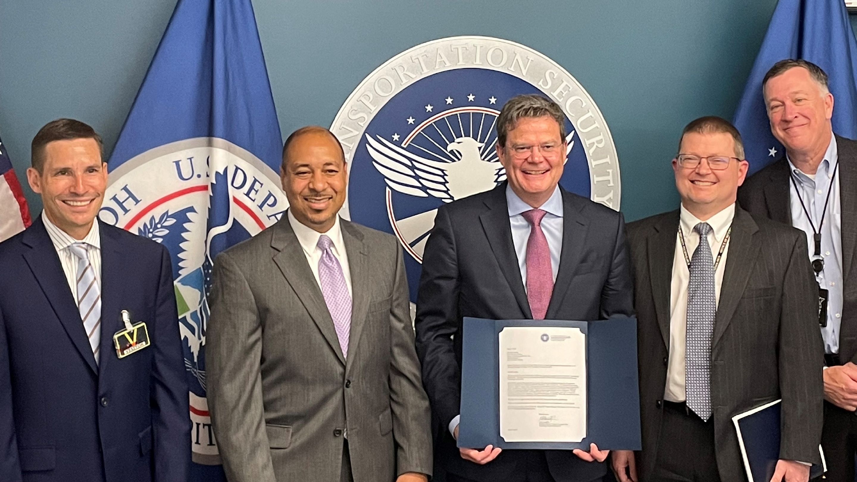 Image above shows from left to right: Frank Dunn, CEO of Rohde & Schwarz USA, Inc.; Mario Wilson, Assistant Administrator for Acquisition Program Management at the Transportation Security Administration’s (TSA); Christian Leicher, President and CEO of Rohde & Schwarz GmbH & Co. KG; Deputy Assistant Administrator Acquisition Program Management at TSA; and Keith Goll, Deputy Assistant Administrator, Requirements and Capability Analysis at TSA. (Photo: Rohde & Schwarz)