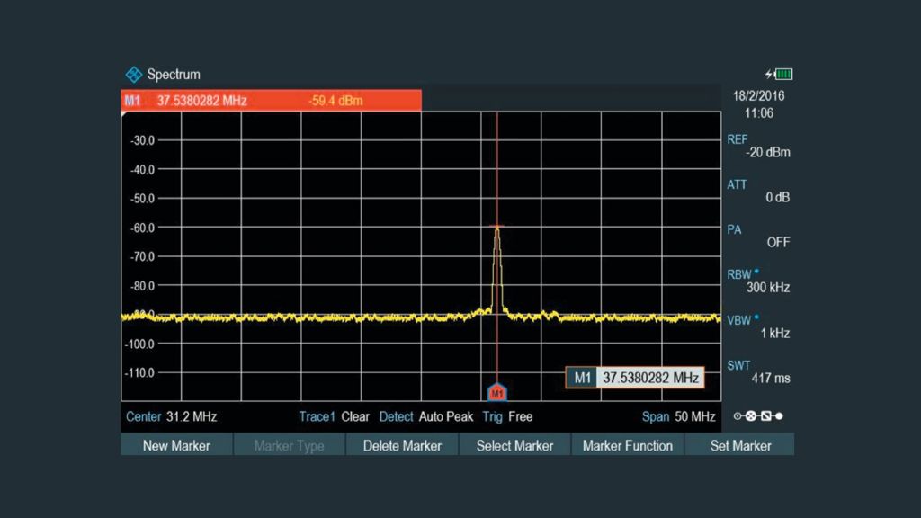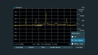 The DUT is switched off. The environmental EMI spectrum with an interferer at 37.538 MHz is measured and stored in the trace memory.