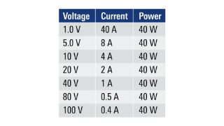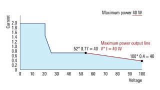 En la práctica, todas las fuentes de alimentación tienen límites en cuanto a la tensión de salida y la corriente que pueden generar. En muchos casos, el factor limitador es la corriente máxima. Por ejemplo, resulta relativamente fácil diseñar una fuente de alimentación de 40 W que suministra 1 A con 40 V, pero es mucho más difícil diseñar una fuente que suministre 40 A con 1 V.