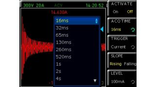 The inrush view is used for more precise analysis of the switch‑on operation, e.g. to determine the melting integral of a fuse. Non‑compressed acquisition of up to 8192 voltage and current points is possible here. A number of trigger options are also available. The ACQ TIME button is used to adapt the recording time to the given requirements.