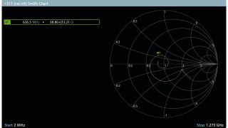 Thanks to the unique design of the R&S®FPC1500 that utilizes an internal VSWR bridge, the spectrum analyzer can perform one-port vector reflection measurements. The middle screenshot in Fig. 4 shows a mixer S11 return loss in dB, the right screenshot in Fig. 4 shows the mixer input impedance in a Smith chart.