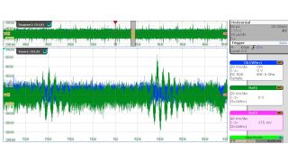 最初に両方のセットアップ(グランド接続の有無が異なる)のコモンモードを測定し、その後で差動電圧を測定します。R&S®RT-ZM モジュール式プローブは、プローブの接続またははんだ付けをやり直さなくても差動モード(DM)測定とコモンモード(CM)測定を切り替えることができるので、この測定に最適です。