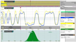 図4の青い波形は、プローブをグランド接続した場合の測定結果を表します。黄色い波形はグランド接続がない場合の測定値を表します。青い波形のTIEジッタは下部の緑色のヒストグラムに表示されます。