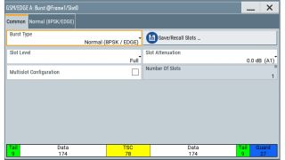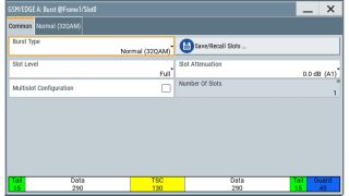 GSM/EDGEおよびEDGE Evolutionオプションによる規格に準拠した信号発生は、基地局とモバイルレシーバーの両方または関連するコンポーネントのテストに用いることができます。各TDMAフレームのタイムスロットは、レベルの減衰またはバーストタイプに対して個別に設定できます。HSCSDに対しては、ハーフレートスロットとマルチスロットを定義できます。EDGE Evolutionの機能拡張としては、ダウンリンクのデュアルキャリア動作、高次変調(例:16QAM、32QAM)とオプションの高いシンボルレートの組み合わせが挙げられます。
